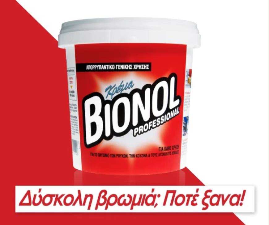 Το BIONOL, χάρη στην εξελιγμένη και πανίσχυρη σύνθεση του εξαφανίζει κάθε σκληρή βρωμιά από ρούχα, κουζίνες, επιφάνειες σπιτιού, αυτοκίνητα, αλλά ακόμη και από τα χέρια σας. Η υψηλή ποιότητα και αποτελεσματικότητα του BIONOL μπορεί και καθαρίζει τα πάντα με την ελάχιστη δυνατή ποσότητα.