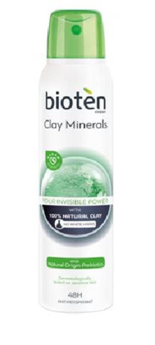 Το γυναικείο αντιιδρωτικό αποσμητικό Bioten Clay Minerals spray 150ml περιέχει 100% φυσικό άργιλο και πρεβιοτικά φυσικής προέλευσης που βοηθούν στην ενίσχυση της φυσικής άμυνας του δέρματος και περιορίζουν τα βακτήρια που προκαλούν την κακοσμία στην περιοχή της μασχάλης. Προσφέρει μοναδικό φρουτώδες άρωμα με αίσθηση βανίλιας που συναρπάζει! Έχει σύνθεση ενάντια στα λευκά σημάδια, 48 ώρες προστασία από ιδρώτα – κακοσμία, είναι Vegan Friendy, δερματολογικά ελεγμένο σε ευαίσθητη επιδερμίδα και δεν περιέχει οινόπνευμα.
