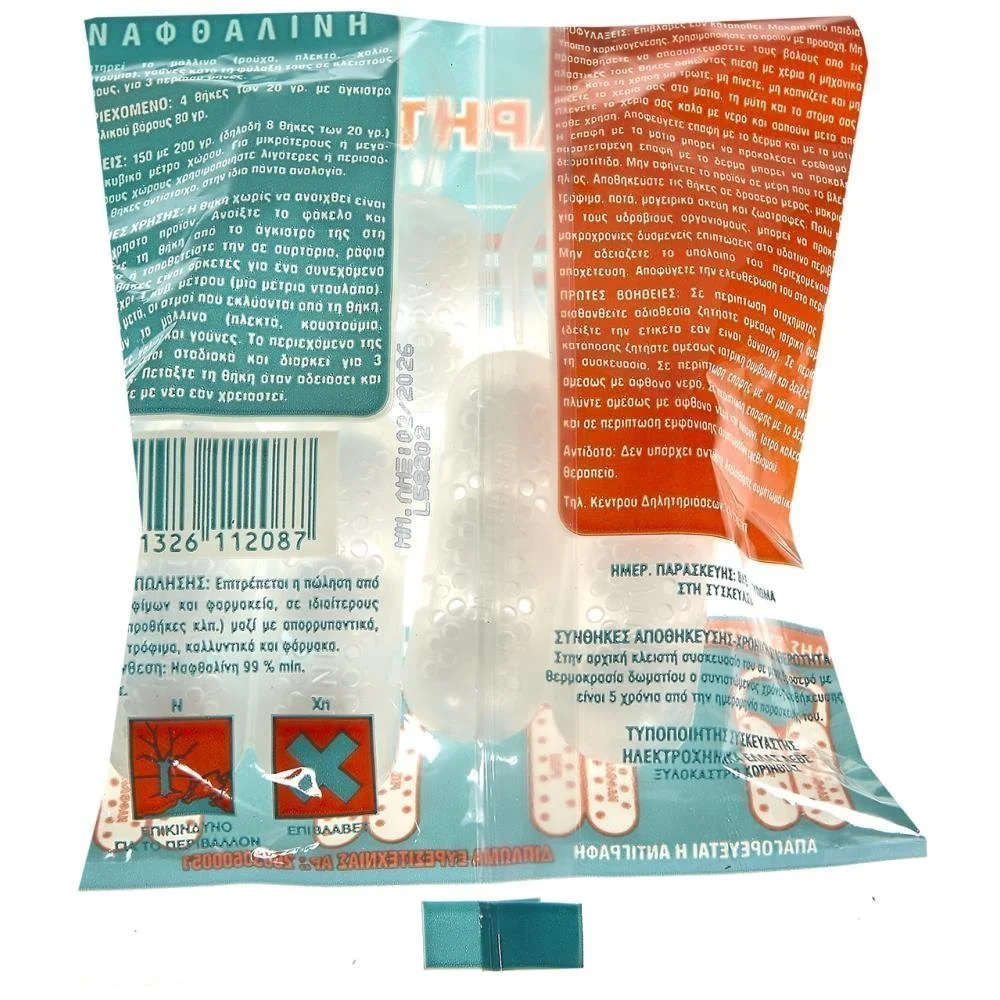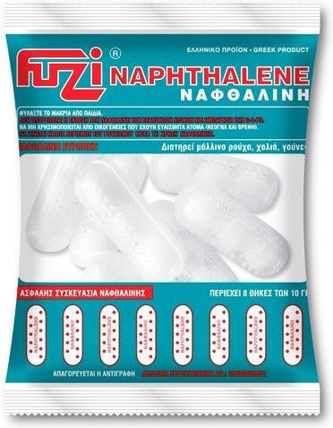 Ναφθαλίνη Ευρώπης. Διατηρεί τα μάλλινα ρούχα, πλεκτά χαλιά, κοστούμια, γούνες κατά τη φύλαξη τους σε κλειστούς χώρους. Ναφθαλίνη fuzi 80 gr.