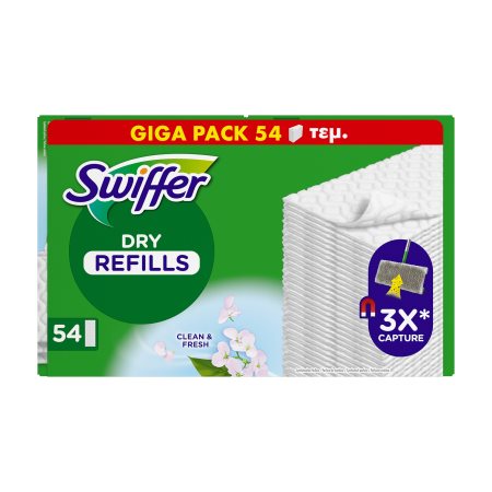 Τα στεγνά ανταλλακτικά πανάκια Swiffer Clean & Fresh χρησιμοποιούνται με τη λαβή Swiffer για να παγιδέψουν και να «κλειδώσουν» βρωμιά, σκόνη και τρίχες από οποιαδήποτε επιφάνεια στο σπίτι σας, 3 φορές καλύτερα από μια παραδοσιακή σκούπα, ενώ αφήνουν μοναδικό άρωμα φρεσκάδας στα πατώματά σας.